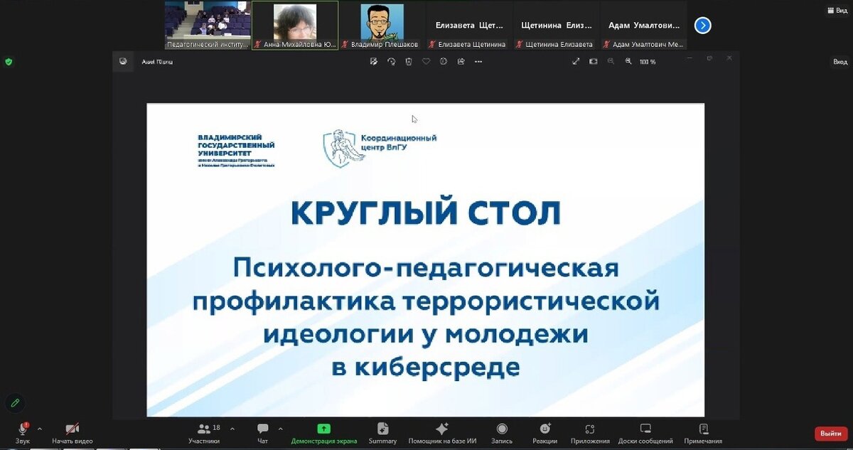 Благодарим модератора круглого стола, нашу коллегу Анну Михайловну Юдину, к.пед.н., доцента, руководителя учебно-методического направления координационного центра по вопросам формирования у молодёжи активной гражданской позиции, предупреждения межнациональных и межконфессиональных конфликтов, противодействия идеологии терроризма и профилактики экстремизма Владимирского государственного университета имени Александра Григорьевича и Николая Григорьевича Столетовых.